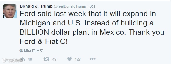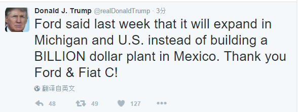 特朗普的另一个促进就业的方案就是制裁想搬迁到国外的美国公司,让他们把公司和工作岗位留在美国。比如福特就被迫取消了墨西哥建厂计划,为特朗普完成了700个就业岗位,受到其Twitter表扬。