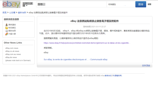 自2021年6月3日起,eBay.fr,eBay.it和eBay.es将禁止销售电子烟、烟油、备件或附配件,卖家无法创建该分类的物品刊登。此外,分类中所有当前物品刊登也将于2021年6月10日前永久刪除。