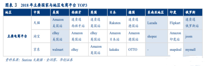 我国跨境电商出口国家以欧美为主,欧美电商市场中 Amazon 依靠强势物流,龙头效应明显。根据中国电子商务研 究中心数据,我国跨境电商出口的主要国家仍然为欧美地区,我国跨境电商出口第一大国为美国,2018 年占比跨境 电商出口的 17.5%,同比提升 2.5pct;其次为法国,占比 13%,同比提升 1.8pct。根据 Sberbank CIB 报告,在美国电 商市场中亚马逊占比 45%,是 TOP2 企业的 6.4 倍,龙头效应明显。俄罗斯受益于电商渗透率尚低,速卖通俄罗斯站(AER)低基数高增长,潜在空间大。根据外跨研究院数据,俄罗 斯网民渗透率约为 20%,整体网民数量为 3000W 人左右,增速为 35%,电商在零售市场占比仅为 6%。Statista 大数 据全洞察数据显示,在俄罗斯市场上第一电商平台为速卖通俄罗斯站(AER),根据阿里速卖通俄罗斯公司发布报 告,2020 年“618 大促”期间(6 月 15-21 日)俄国消费者在速卖通上消费额同比增长 60%左右,属于低基数高增长市场。