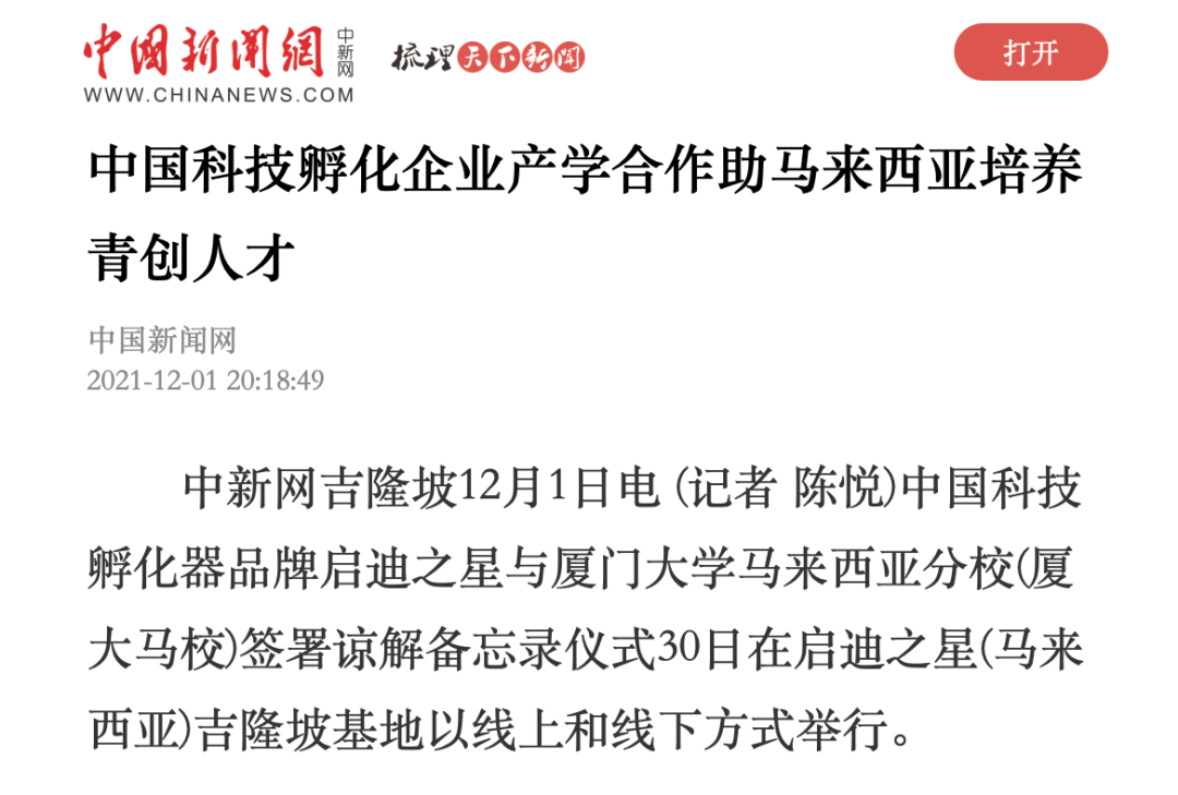 12月1日,《中国新闻网》对启迪之星与厦门大学马来西亚分校的合作签约进行报道。未来,双方将共同培养中马数字创新青年,共建中国-东盟数字科创生态圈。