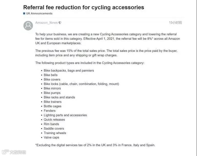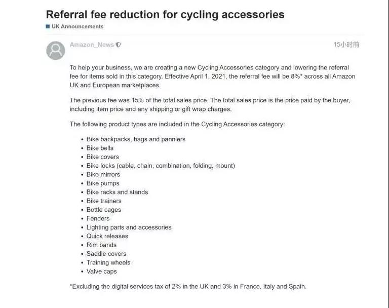 自2021年4月1日起,亚马逊欧洲站自行车配件佣金降至8.16%,此前费用是总销售的15.3%。