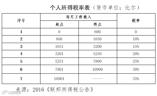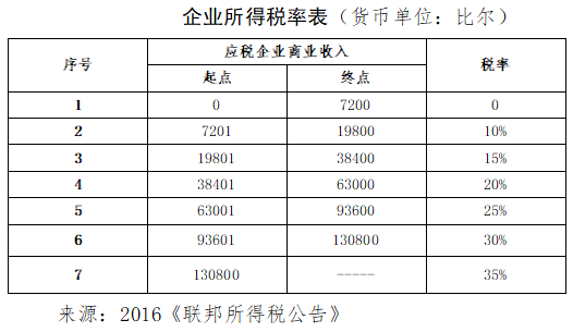 按企业收入总额的30%进行征收,分配给股东的股息收入按10%的预扣税税率征收所得税。非公司商业机构商业活动在7201-130800比尔之间的,税率在10-30%之间不等,收入超过130800比尔的,税率为35%。埃塞的外资企业统一按照利润总额的30%缴纳。企业纳税年度发生的亏损,准予向后年度结转,但结转年限最长不得超过三年。