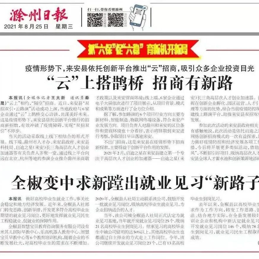 滁州日报:启迪之星来安“云”上搭鹊桥,为来安吸纳高层次人才