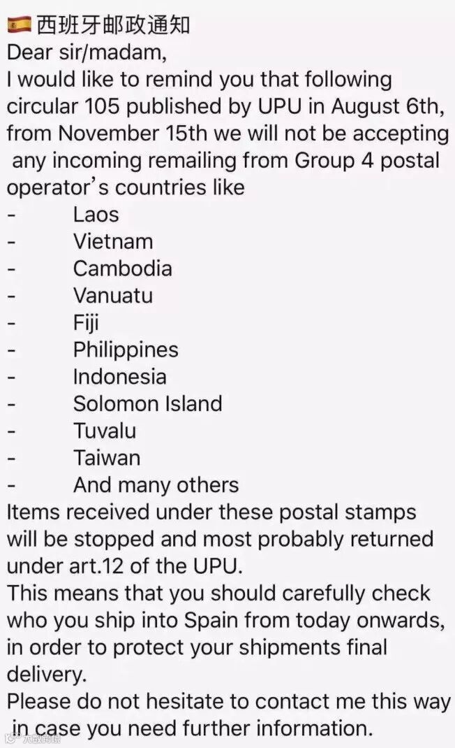 说白了就是人家西班牙已经不愿意通过继续补贴本国邮政来使更多的中国跨境电商包裹以极低的邮费入境了。