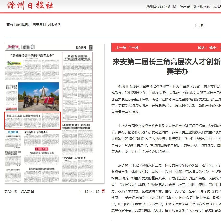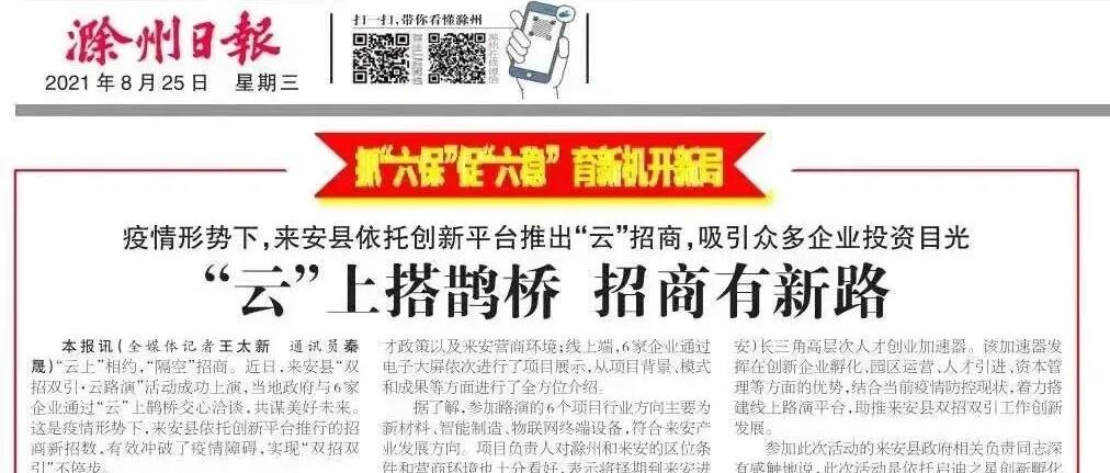 滁州日报:启迪之星来安“云”上搭鹊桥,为来安吸纳高层次人才