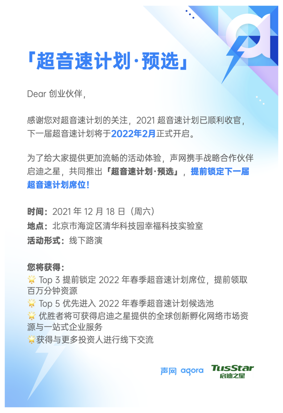 启迪之星携手生态合作伙伴声网Agora(NASDAQ:API),就「超音速计划」推出「超音速计划·预选」活动,提前锁定2022年春季超音速计划席位,为进入超音速计划的创业者提供三个月的创业伙伴营、免费实时音视频分钟数、生态产品免费套餐包、技术支持、投资咨等一系列的资源扶持,进而赋能开发者更低成本、更高效地实现创新创业。