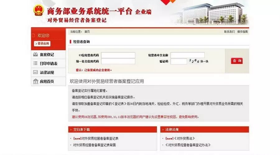 近日,对外贸易经营者备案应用已纳入商务部业务系统统一平台,页面更新,请通过企业备案地址(http://iecms.mofcom.gov.cn/)开展相关业务。