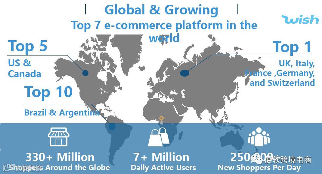 Wish拥有330+Million个店铺,日活跃7+Million,日增新顾客250000+。
