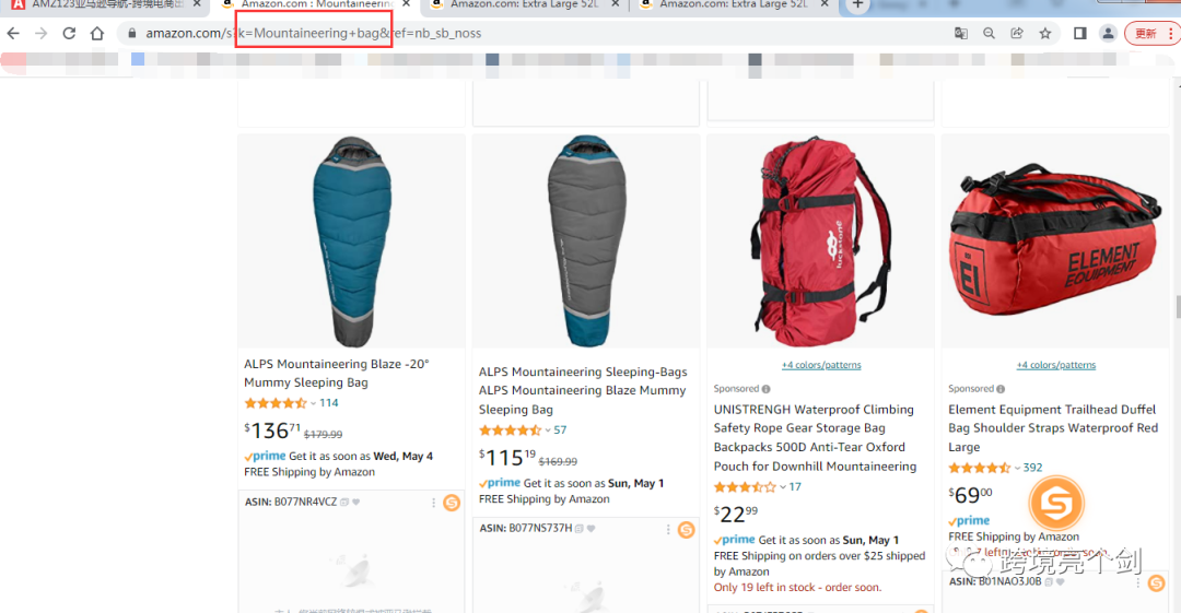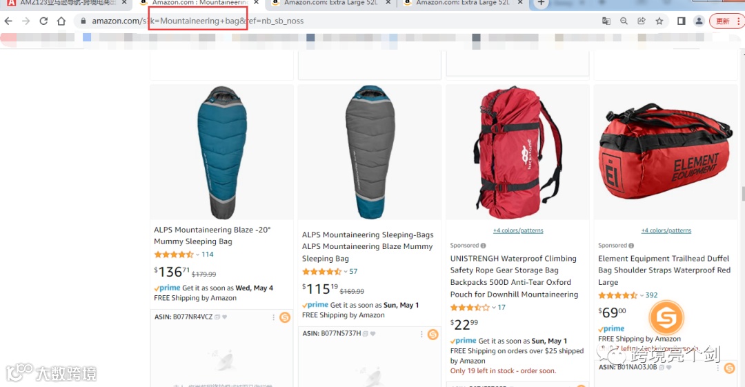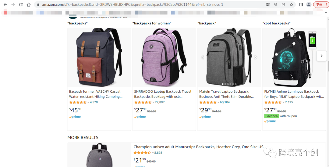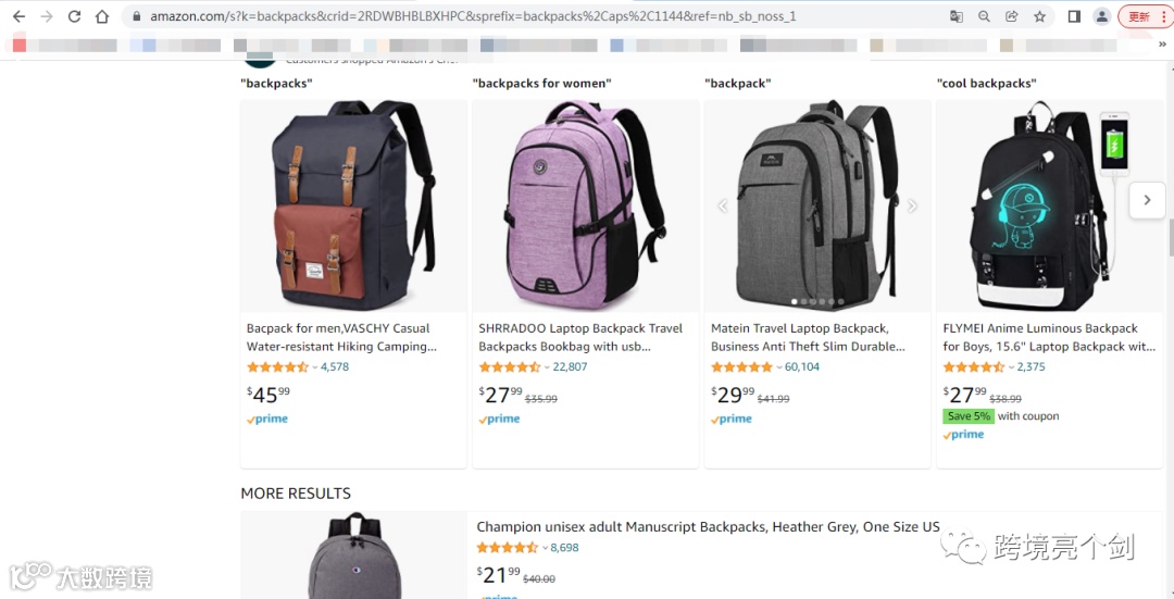 从日常生活中我们对登山包这个产品的外观印象能够看出来,搜出来的结果是不-样的。大概可以知道backpacks 这个单词的搜索结果更准确。