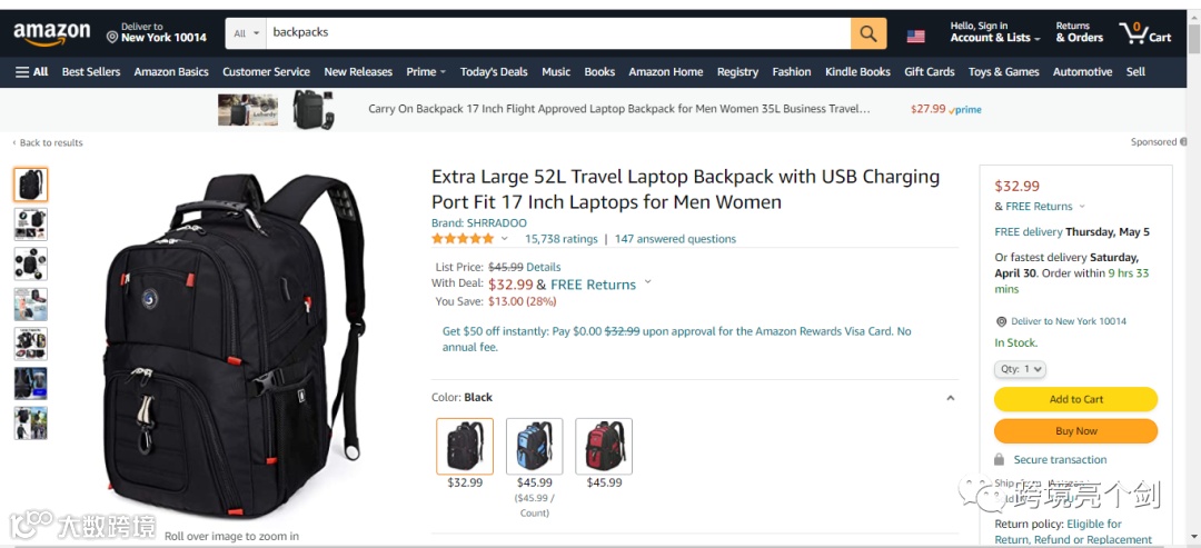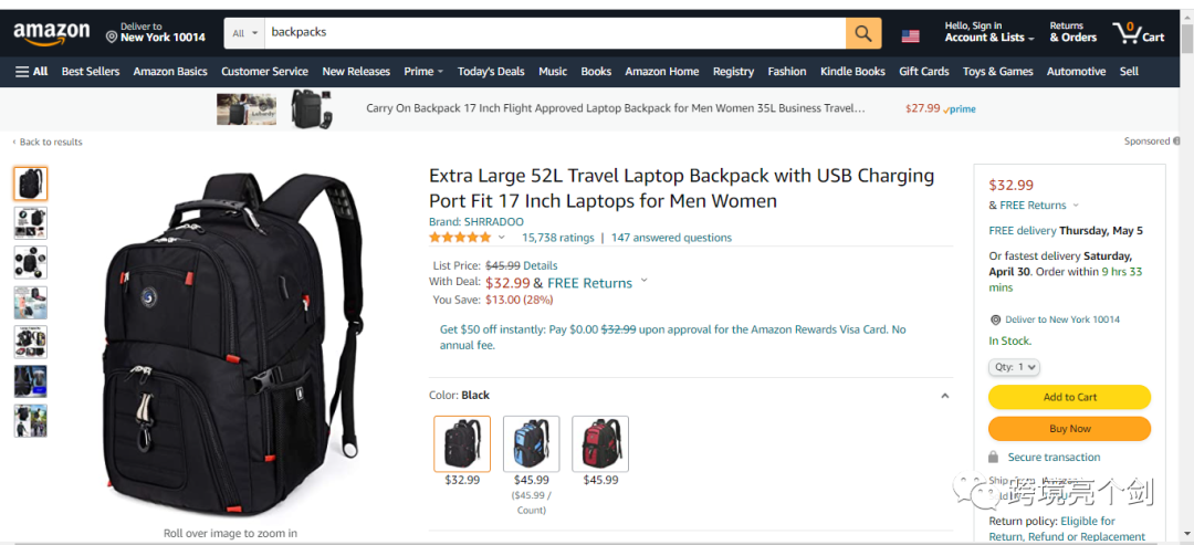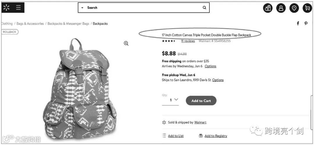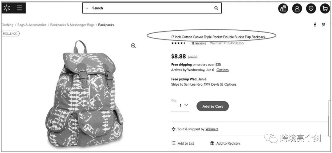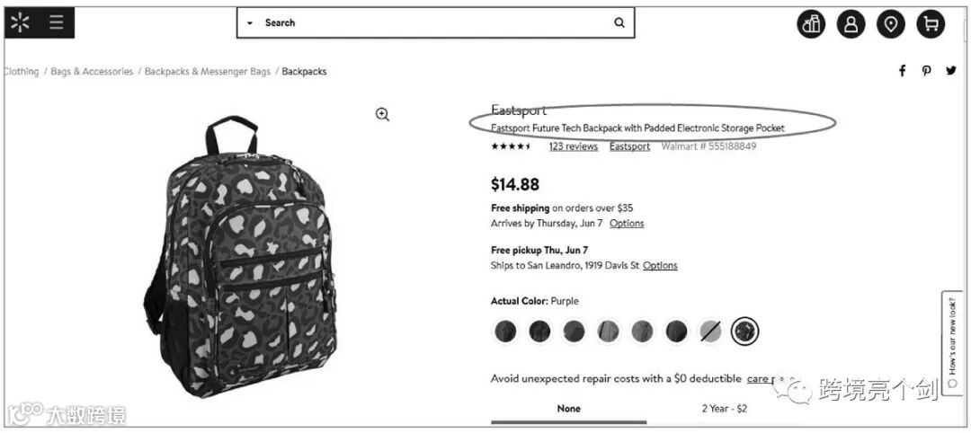 这样写出来的标题至少可以做到80分。但是如果想写出更加地道的美式英语标题和英式英语标题,就需要卖家到美国本土的一些电商平台看看同类产品是怎么写的。美国的沃尔玛电商平台也有着较大的知名度,网址是www. wa Imart. com,还是搜索刚刚比较精准的关键字backpacks, 如图6. 17和图6. 18所示。