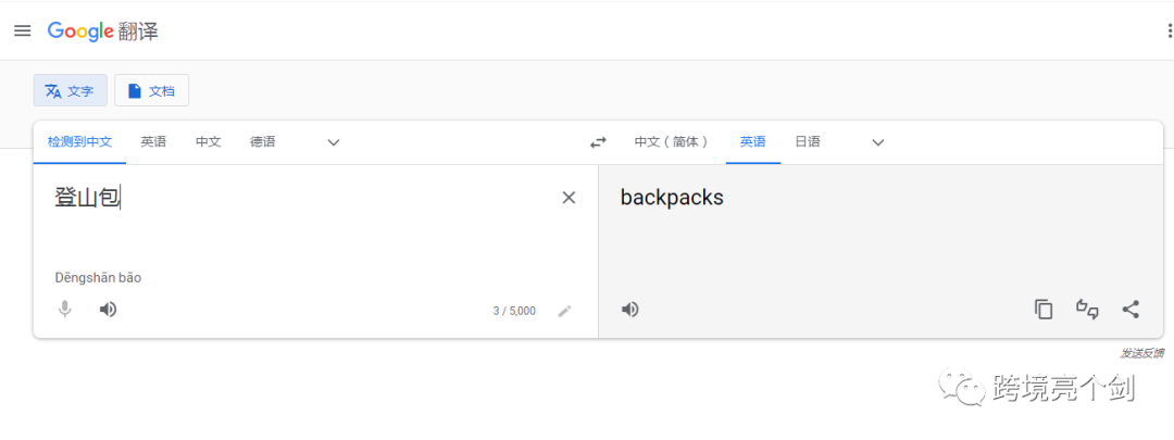 首先,把登山包这三个汉字,写到翻译软件中,推荐使用谷歌翻译、有道翻译,如图6.12 所示。不同翻译软件翻译出的结果不同。