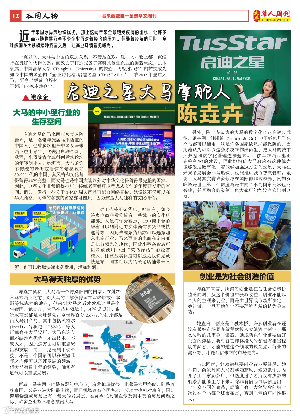 近日,大马华人周刊《本周人物》专栏对启迪之星(马来西亚)执行总经理陈垚卉进行了专访。采访中,陈垚卉就大马的投资潜力、中小型行业的生存空间等话题分享了观点,并针对青年创业提出多个建议。以下为报道全文。