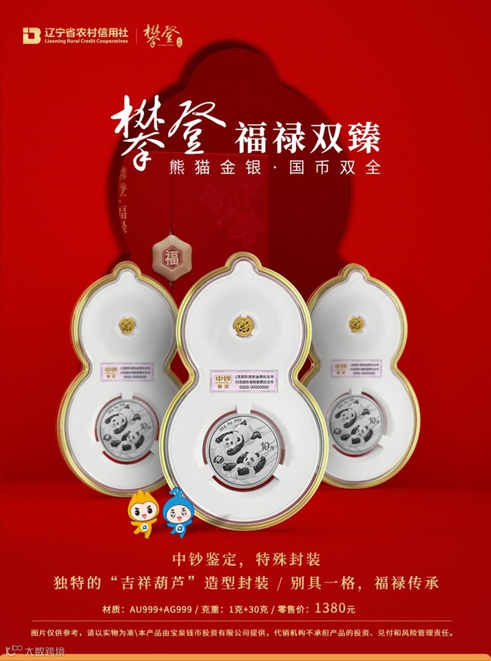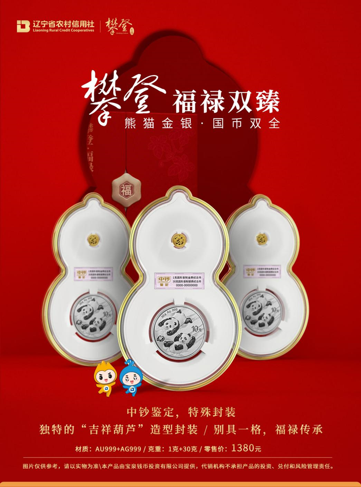《攀登·福禄双臻》产品以辽宁农信“攀登文化”的理念为创意基础,将1枚熊猫金币和1枚熊猫银币以独特的“立体葫芦”造型组合封装,一上一下的搭配,不仅很好的诠释了“攀登文化”的精髓,而且吉祥的“葫芦”造型与一金一银两枚熊猫币也寓意着福禄双全的美好生活。“攀登文化”“攀登·福禄双臻”,更是“攀登美好幸福生活”的美好祝愿。