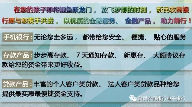 新民农商银行为广大学子免费办理金信卡,免费开办网上银行、手机银行、短信银行业务,跨行转账免费,家长给孩子汇生活费再也不用担心手续费了!