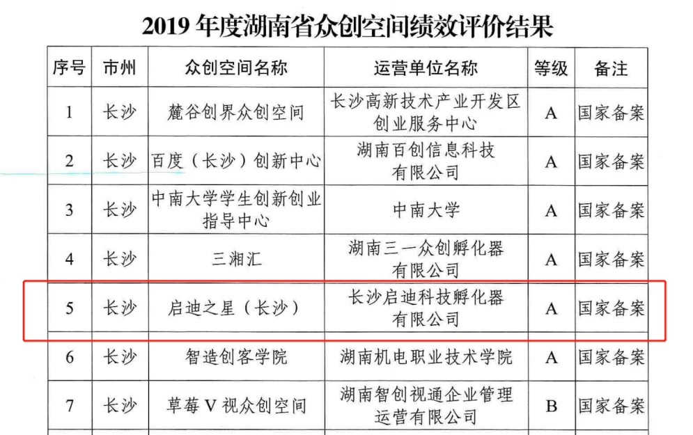 启迪之星(长沙)作为国家备案众创空间在湖南省的年度绩效评价中,获得优秀(等级A);