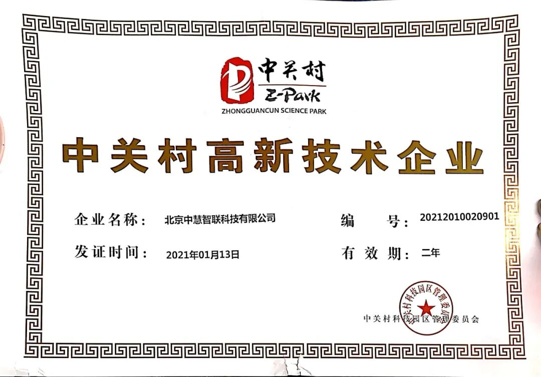 在孵企业中慧智联获得中关村高新认证