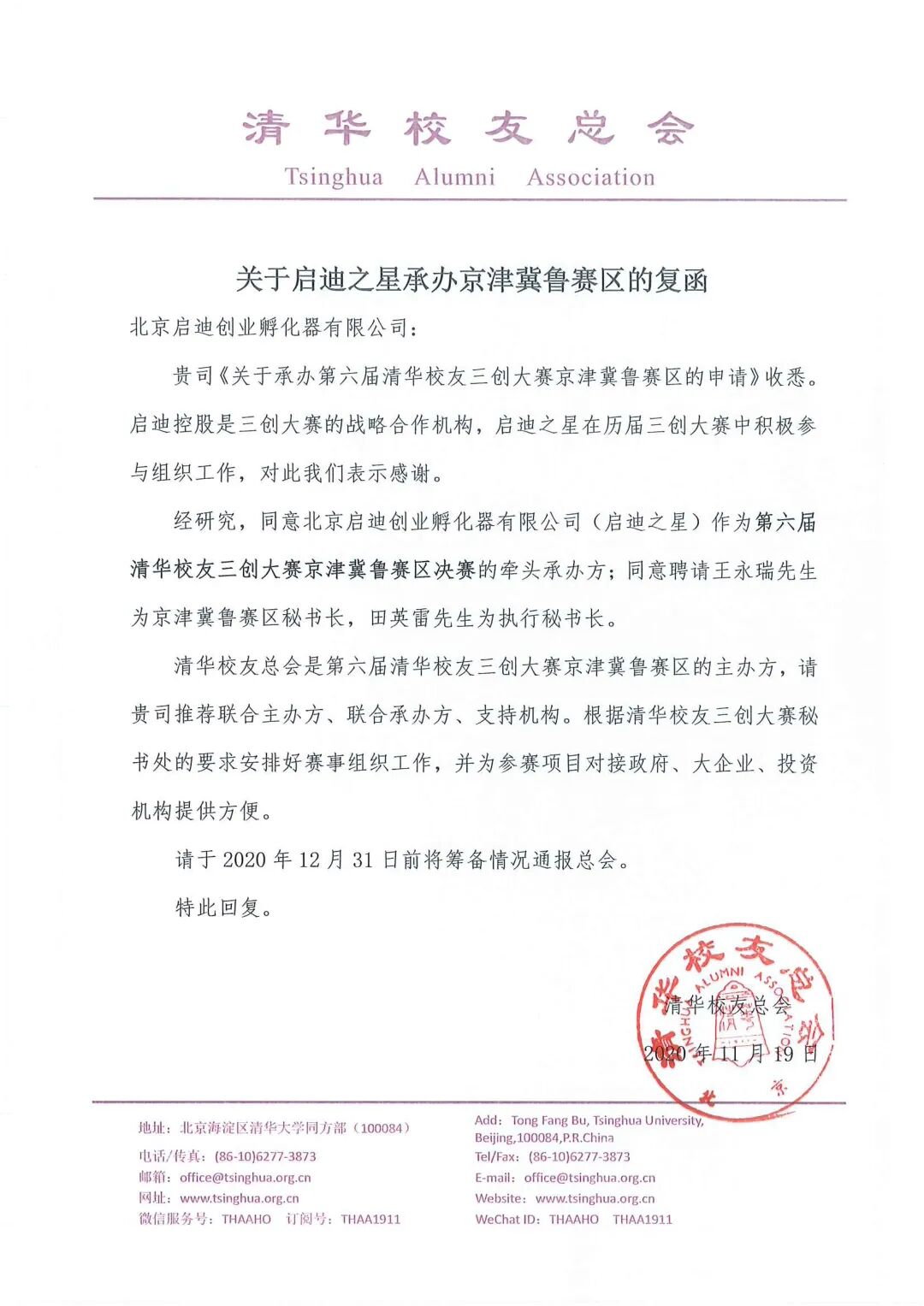 启迪之星获第六届清华校友三创大赛京津冀鲁赛区承办权!