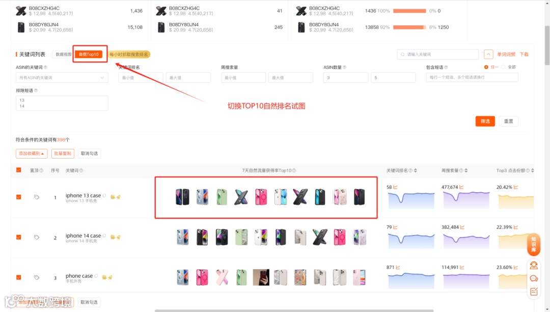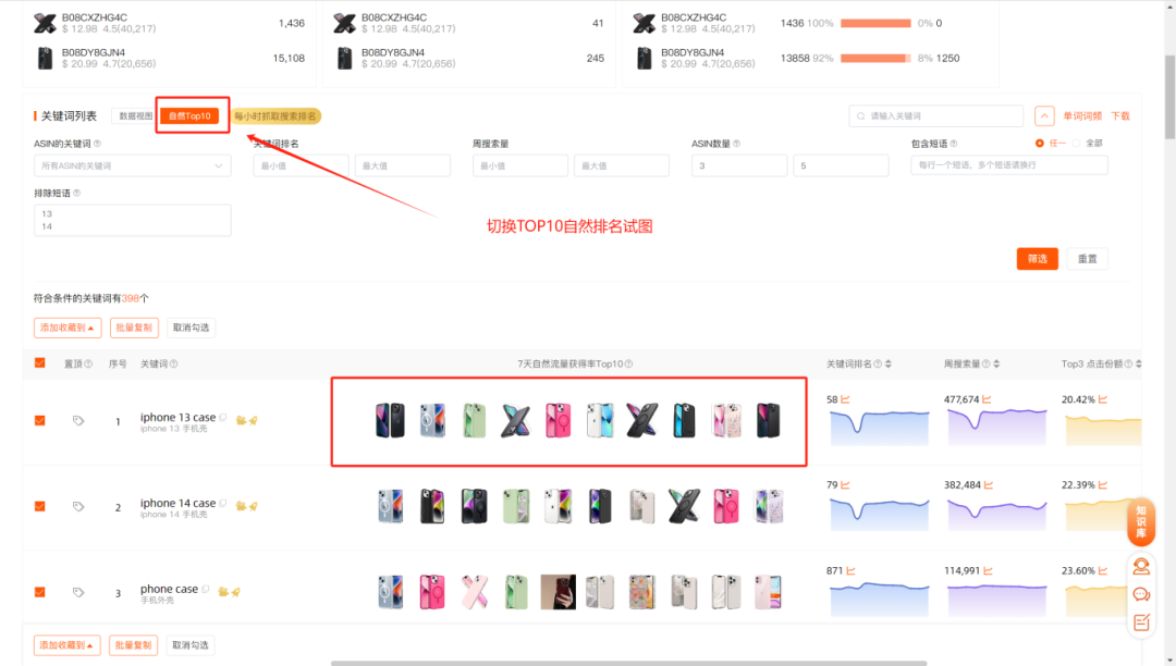 切换“TOP10视图”,显示当前关键词下自然排名前10的ASIN图片,帮助快速判断该关键词和产品的相关性,并且可以提前否定和产品不相关的关键词,避免广告费空烧的情况。
