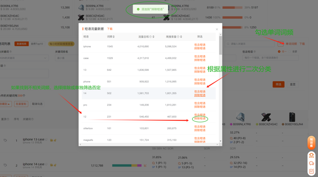 针对单词词频中出现的不相关词频,我们可以选择“排除短语”或选择单独筛选出来在后台进行否定,提前避免广告费空烧的情况。