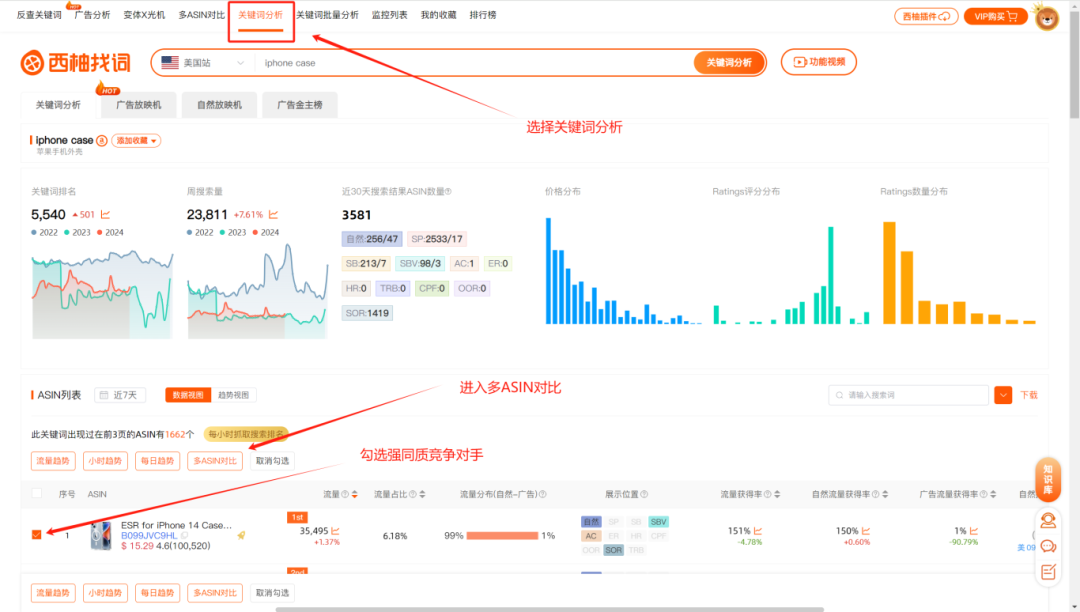 1、关键词分析:输入核心词在ASIN列表中找强同质ASIN进行多ASIN对比