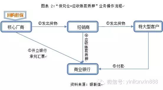 所谓“保兑仓+应收账款质押”业务,就是指核心厂商、经销商、银行签订《三方合作协议》,经销商以下游特大型客户待付的应收账款质押,填满银行签发的银行承兑汇票敞口,银行根据经销商提供质押的应收账款金额通知厂商释放货物。通常质押应收账款到期日在新签发银行承兑汇票之前,这部分质押的应收账款可以用于100%提货。为了控制风险,如果应收账款到期前没有被付款,经销商必须立即以现款赎回应收账款。