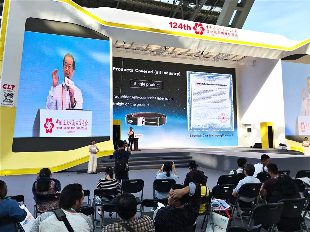 10月 31日下午,贸点点创始人陈良先生继123届后,再次受邀登上广交会中平台(中央大舞台),用全英文发表了题为《Establish the quality benchmark basing on the optimization of trace to the source & anti-counterfeit system--Innovative practice taken by TradeAider in the field of trace to the source & anti-counterfeit》(完善溯源体系,打造质量标杆——贸点点在品控及溯源防伪领域的创新实践)的主题演讲,向世界精彩呈现了贸点点创新溯源防伪“品牌守护神”。