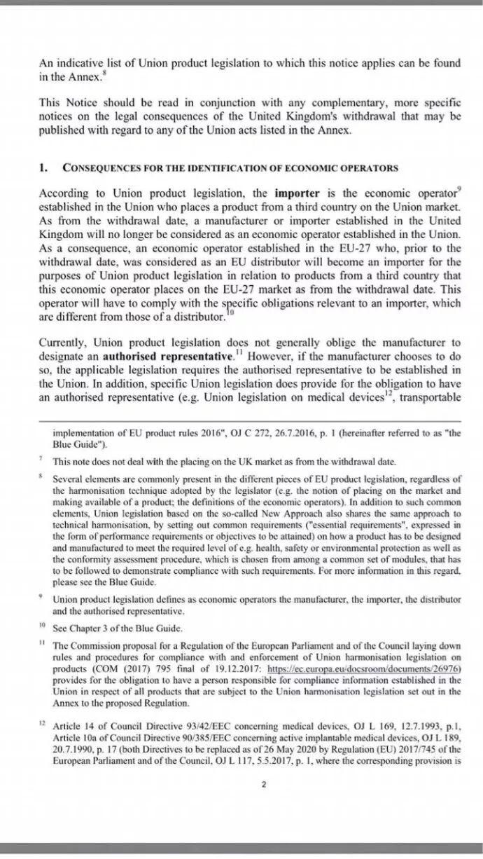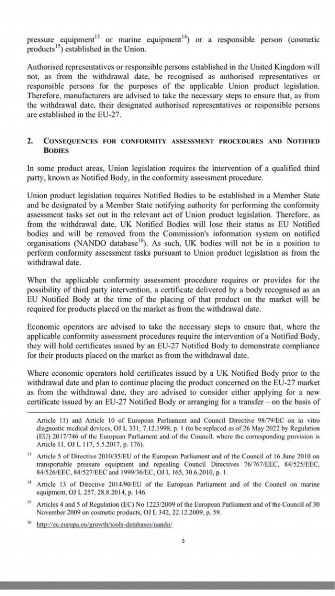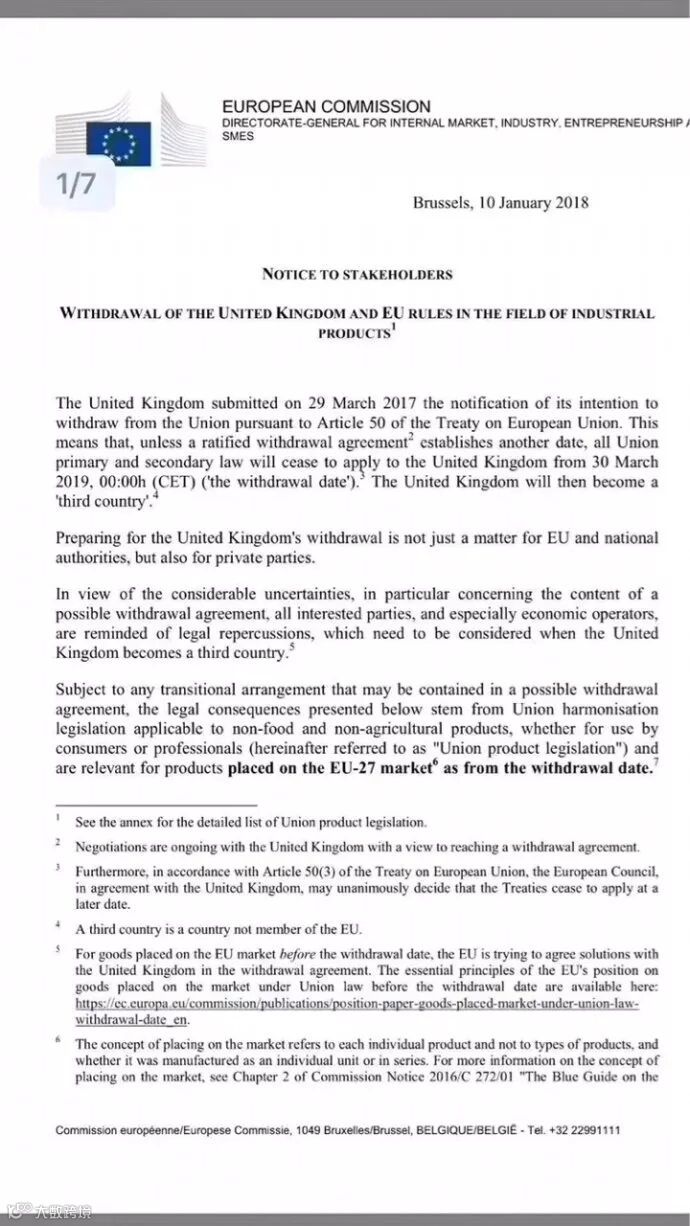 受此公告影响,所有英国的产品、厂商以及认证机构都将不再适用欧盟的自由流通政策。据悉欧盟公告机构共2000多家,英国占100多家,意味着这些英属机构发的CE证在2019年3月30日之后全部失效!