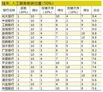 也就是说,在《投资者报》的评分中,以百姓的切身需要为重,对挂失和人工服务的设置给予“半壁江山”的分值。为什么呢?当客户银行卡或存折丢失时,当务之急就是要先挂失,大多数人都会先通过电话进行挂失,如果挂失按键位置靠前,则可以适当减缓客户内心的焦急程度,所以我们认为挂失键越靠前,挂失功能服务得分相应越高。