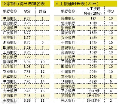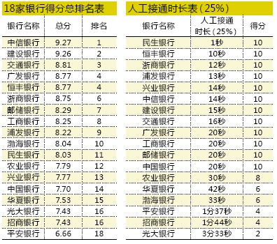 最后,将五项指标的分数按照权重比相加,得出电话银行服务的总分。统计结果显示,得分最高的前三家银行为中信、建行和交行。■