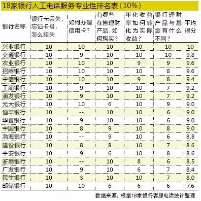调查显示,重要功能便捷性得分前三名为光大、中信、工商和渤海;接通速度得分前三名为民生、恒丰和浙商;专业性得分前三名为兴业、交行、农行和招行