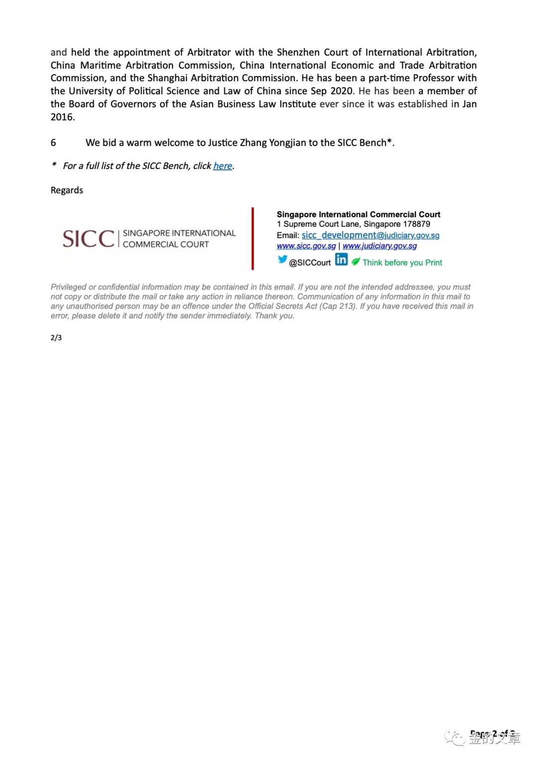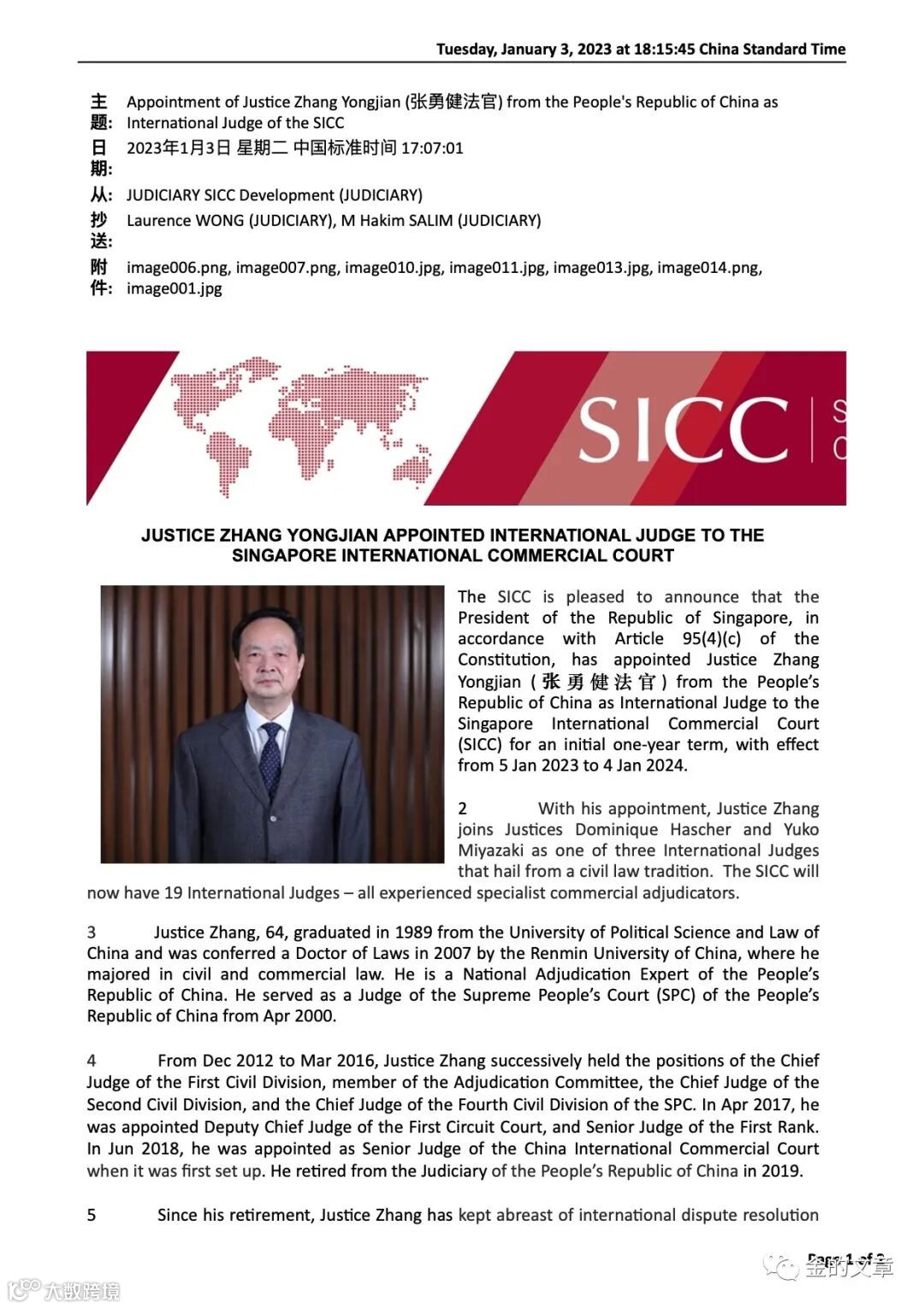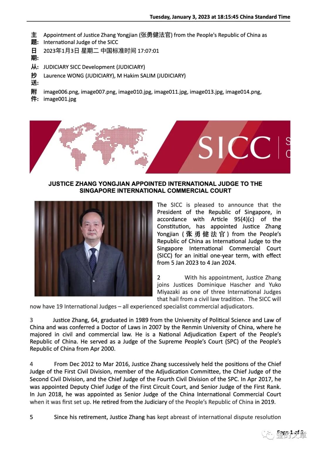 JUSTICE ZHANG YONGJIAN APPOINTED INTERNATIONAL JUDGE TO THE SINGAPORE INTERNATIONAL COMMERCIAL COURT
