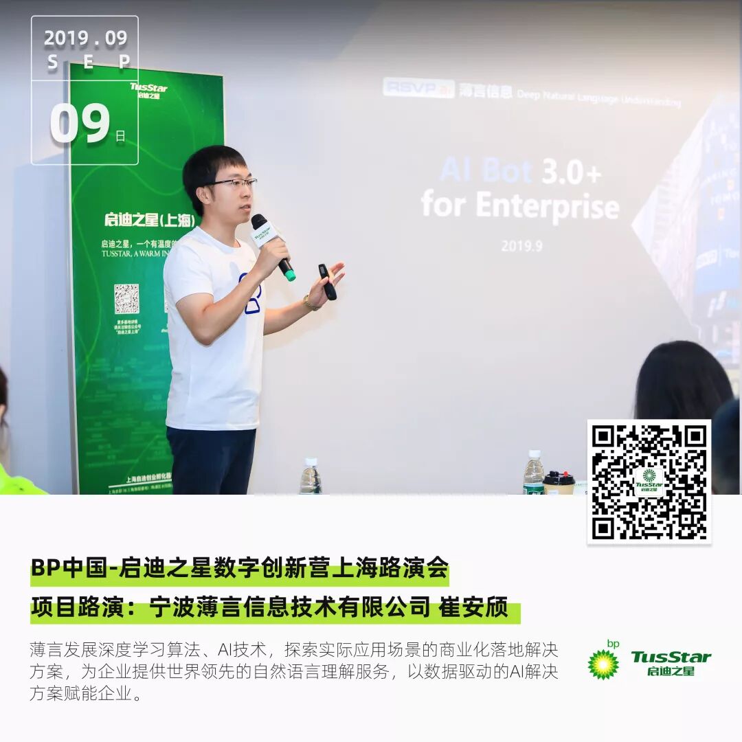 9月9日,BP中国-启迪之星数字创新营上海路演会在上海启迪之星举办。本次活动由BP中国和启迪之星联合主办,由上海启迪之星承办,杨浦科创集团和长阳创谷共同协办,面向新一代汽车、人工智能、物联网、机器人等技术和应用领域的创新企业,旨在寻找助力能源行业下游业务及跨业务单元数字化转型的创新技术。