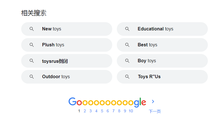 关联搜索这个其实跟百度也是一样的,就是当我们在Google输入关键词时,有些时候在Google页面下方会有一些其它的相关搜索,这些都是其它用户在Google搜索时搜索的,同时也是一些搜索频率较高的词,而这些相关搜索也是独立站运营者长尾关键词的重要来源。例如搜索Toys会出现: