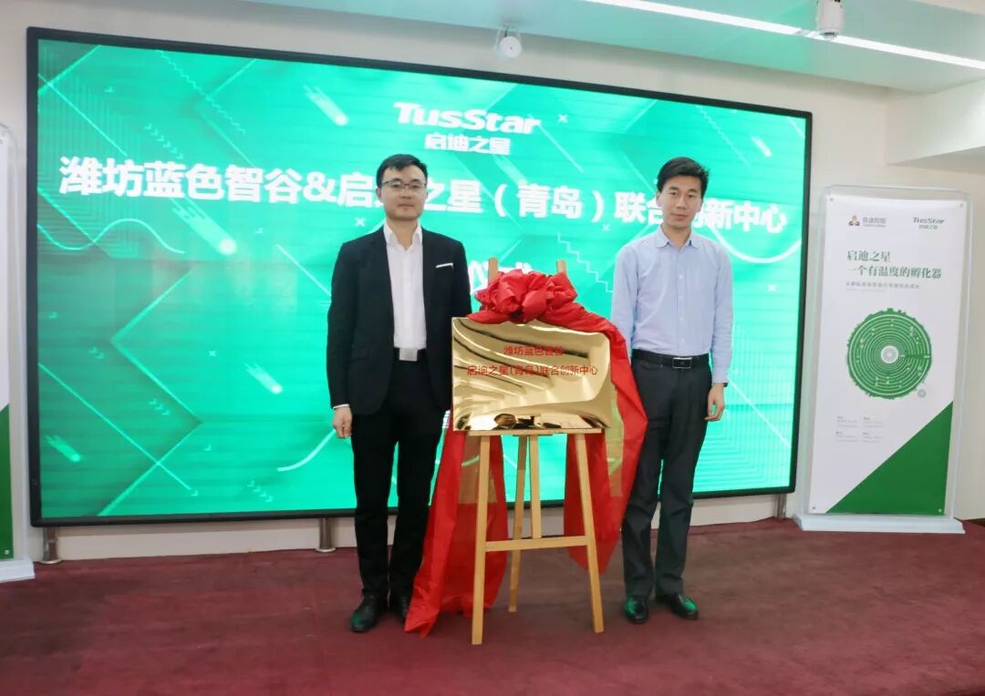 潍坊蓝色智谷园区服务中心副主任汤国磊与启迪之星孵化器业务拓展总监、启迪之星(菏泽)孵化器总经理曹萌共同为潍坊蓝色智谷·启迪之星(青岛)联合创新中心揭牌。