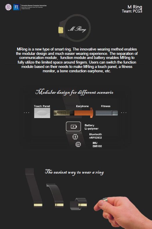 MRing is a new type of smart ring. The innovative wearing method enables the modular design and much easier wearing experience. The separation of communication module, function module and battery enables MRing to fully utilize the limited space around fingers. Users can switch thefunction module based on their needs to make MRing a touch panel, a fitness monitor, an bone conduction earphone, etc.