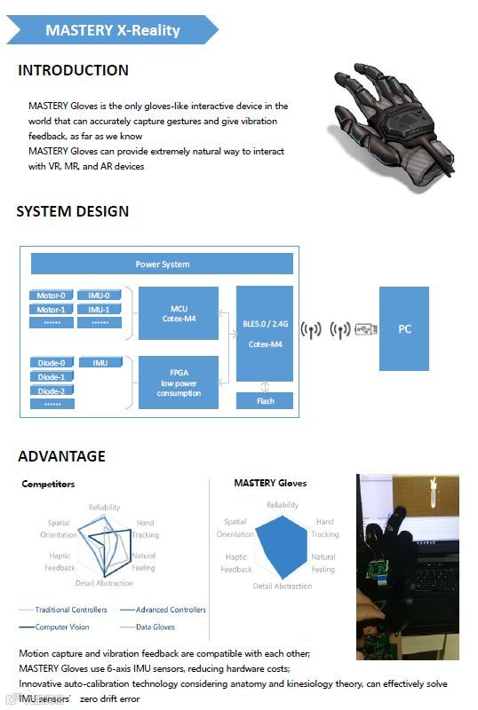MASTERY is now known as the first and the only data glove (interactive device) in the world which can both conduct the motion captureunder high accuracy (19 DOFs can be satisfied among 22 DOFs in total on eachhand) and physical feedback under various points. MASTERY will provide people with the most natural interactive experience in VR, MR and AR world in the future.