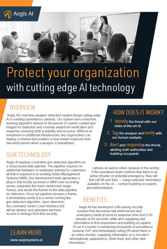 AegisAI employs computer vision to automatically detects guns in existingsecurity camera feeds then notifies the police and provides early warning tobuilding occupants. It saves lives in active shooter situations by reducingpolice response times from an average of 18 minutes down to an average of 8minutes, and by providing building occupants with the live informationnecessary to take evacuation or defensive measures. Aegis AI's human-in-the-loop model means that registered detections will be confirmed by atrained analyst before law enforcement is notified, providing additionalredundancy that ensures flawless accuracy and peace of mind.