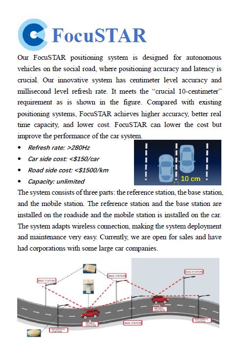 FocuSTAR is a positioning system applicated in the field ofautonomous driving on social road, which provides centi-meter level location servicesto vehicles. Owing to our innovative system design, vehicles can dissolve andreceive other their and others’ location information spontaneously, achieving unlimited system capacity. The system function includes positioning navigation, path planning and information query.