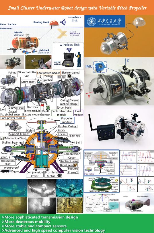 In the transmission scheme and propeller propeller design, thechoice of variable pitch propeller structure makes the structure of thevariable pitch propeller compact, stable and flexible, and provides sufficientspace and stable platform for carrying more carriers; the sub machine is amicro bionic underwater robot, which can drill into corals holes and rockcrevices. Use electromagnetic oscillating tail to provide power, adjust motor's slider to adjust the state of pitch and low disturbance. Their advantages are combined to adapt to the complex underwater investigation environment, themost likely to realize the replacement of human resources, complete theUnderwater Unmanned search work; design a supporting ground station controlsystem, can switch remote control and autonomous cruising mode, can use gesture recognition control, enhance the sense of experience.