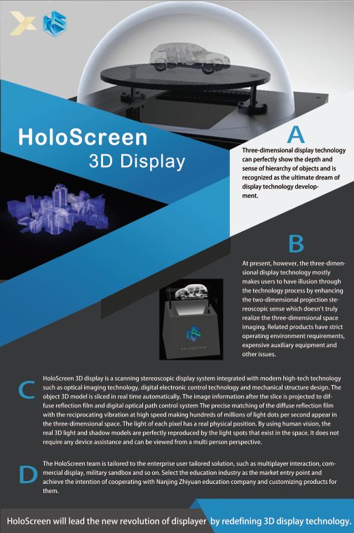 Three-dimensional display technology can perfectly show the depth and sense of hierarchy of objects and is recognized as the ultimate dream ofdisplay technology development. Holoscreen interactive dynamic 3D display adopts scanning body 3D display technology, which utilizes mechanical structure to drive high-speed vibration of planar holographic film. Accurately match theprojection device with frame rate up to 4000 frames per second, project the cross-sectional view of the three-dimensional object in the corresponding position of the space, use the visual persistence effect of the human eye, analogize to the principle of 3D printing, accumulate light and shadow in the space, thereby realizing Real spatial stereo imaging. At this time, it helps empower 1-6 people to visualize, communicate, learn and have fun in acollaborative manner with no barrier to the 3 dimensional experience. HoloScreen will lead the new revolution of displayer by redefining 3D display technology.