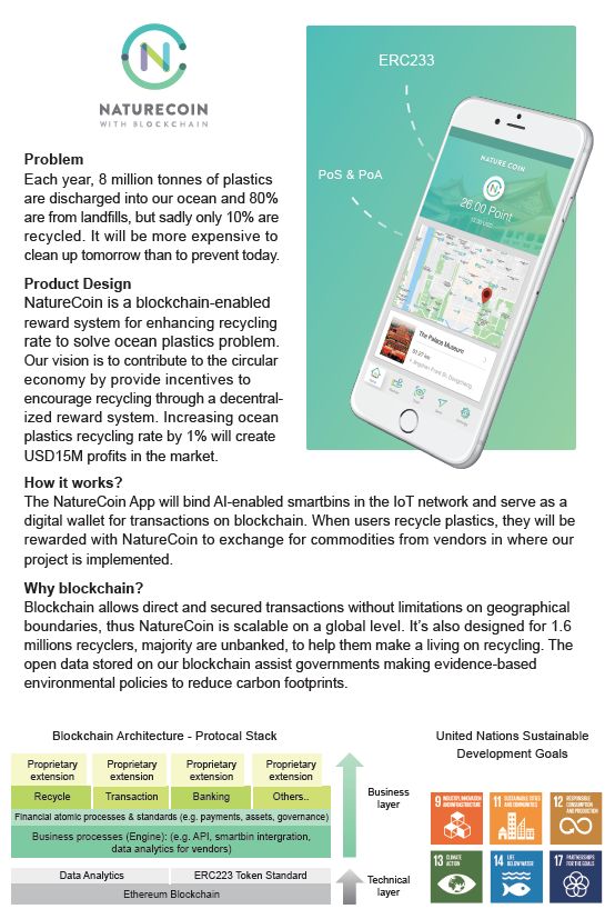 Nature Coin utilizes blockchain and IoT technologiesto reward users for their sustainable actions. It makes recycling profitable bybuilding a global economy connecting individuals with environmental cause. In order to encourage recycling, users will be rewarded with our cryptocurrency, NatureCoin, when they recycle plastics in our smart bins and then exchange forgood and services in communities. Our vision is to deploy smart bins via large scale plastic recycling network incities and our NatureCoin app will act as a digital wallet for transactions on blockchain, bind all hardware in the system, provide data analysis to monitor performance. Blockchain ensures secured and direct transaction betweenusers without geographical boundaries, which allows our project to scale on a global level. NatureCoin is also designed for people who do not own a bank account in least developed countries (LDC) and to help bridge the wealth gap as they canmake a living on recycling.