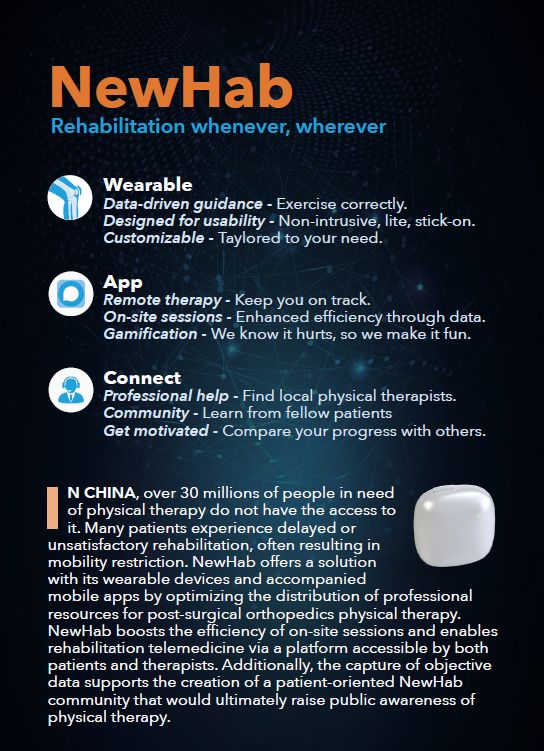 In China, physical therapy is a trailing domain where its servicehas not yet met the needs of millions due to the limited number ofprofessionals, a lack of public awareness and the rigid constraints caused by the Chinese rehabilitation system. Consequently, many patients experience unsatisfactory rehabilitation, often resulting in mobility restriction. New Hab aims to solve this problem with its robust and patient-friendly wearabledevices by optimizing the distribution of professional resources for post-surgical orthopaedics physical therapy. Hew Hab boosts the efficiency of in-clinic physical therapists and enables rehabilitation telemedicine via a web portal accessible by both patients and therapists. In addition, the capture of objective data supports the creation of a patient-oriented data-driven New Hab community that would ultimately raise public awareness of physical therapy.