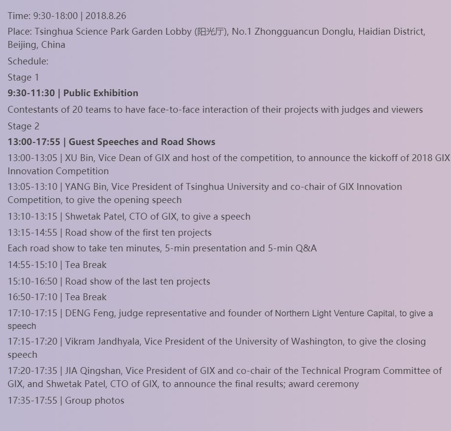 由清华大学GIX学院举办,启迪之星特别支持的2018GIX创新大赛决赛即将于2018年8月26日在清华科技园阳光厅举行。届时,来自全球的20支队伍将向评委和公众展示他们的创新项目,选手来自美国、韩国、印度尼西亚、中国等多个国家。