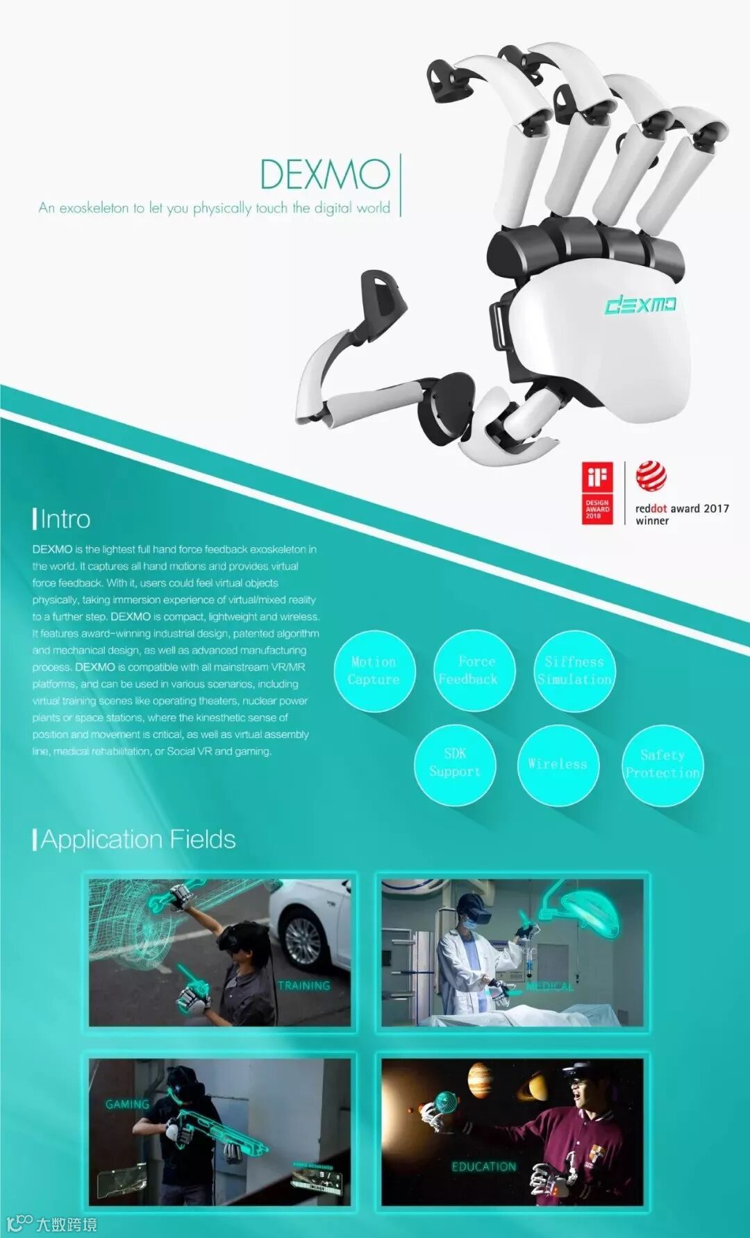DEXMO is thelightest full hand force feedback exoskeleton in the world. It captures allhand motions and provides virtual force feedback. With it, users could feelvirtual objects physically, taking immersion experience of virtual/mixedreality to a further step. DEXMO is compact, lightweight and wireless. Itfeatures award-winning industrial design, patented algorithm and mechanicaldesign, as well as advanced manufacturing process. DEXMO is compatible with allmainstream VR/MR platforms, and can be used in various scenarios, includingvirtual training scenes like operating theaters, nuclear power plants or spacestations, where the kinesthetic sense of position and movement is critical, aswell as virtual assembly line, medical rehabilitation, or Social VR and gaming.