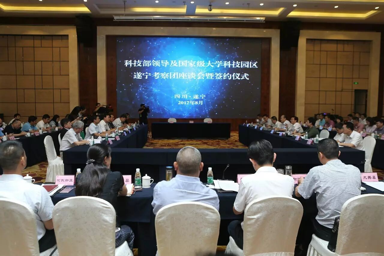 8月29日,由科技部相关领导及大学科技园区负责人组成的考察团在四川省遂宁市进行调研,考察团座谈会暨签约仪式举行。科技部火炬中心主任张志宏,遂宁市委副书记、市长杨自力,以及来自北京、上海和深圳的企业孵化器负责人,清华大学、北京航空航天大学、北京化工大学、同济大学、西安交通大学、重庆大学科技园区负责人出席会议。四川遂宁市委常委、副市长罗晖主持会议。