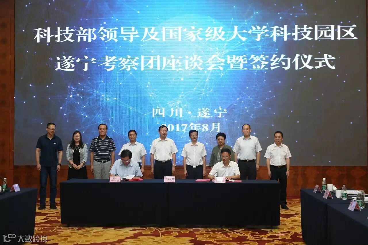 在科技部火炬中心主任张志宏,遂宁市委副书记、市长杨自力的见证下,启迪控股副总裁、启迪之星董事长张金生与遂宁物流港管委会主任牛斌签署了合作协议