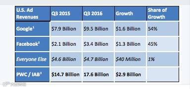 3,谷歌和Facebook控制了75%在线广告和这一市场在2016年的几乎所有增长
