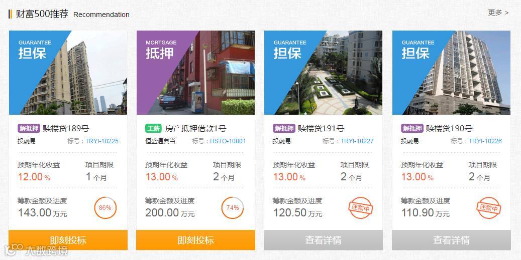 在通过平台运营模式降低成本的同时,入驻财富500的店铺均是区域内和行业内的实力领先机构,发售的产品也都是具有较高收益及安全有保障的优质借贷产品。以平台主打的“赎楼贷”为例:赎楼贷是指在二手房交易过程中,卖方(房产出让方)为了归还银行房贷,解除房产抵押,赎回房产证,而向第三方申请垫资借款。赎楼贷的还款来源为卖方售楼所得款项,这种业务广泛存在于居民二手房交易中,其中垫资方通常为房产交易中介、第三方垫资机构或者个人出借者。随着互联网金融的兴起,赎楼贷产品成为互联网金融公司争抢、投资者喜爱的优质稀缺资产。产品特点1、期限短,1-2个月,适合短期投资者;2、收益高,年化12-14%;3、安全性高,还款来源是售楼款,明确可靠;4、借款人及担保公司连带责任担保。
