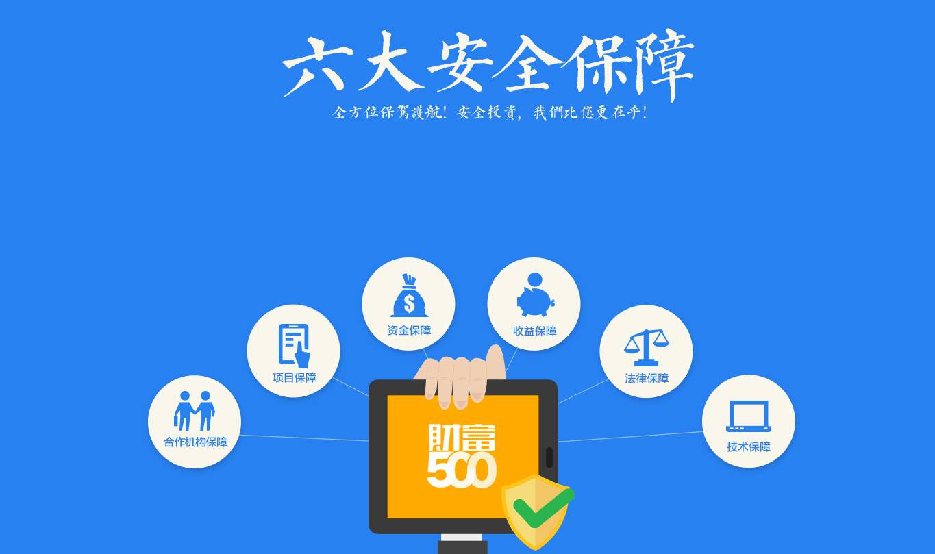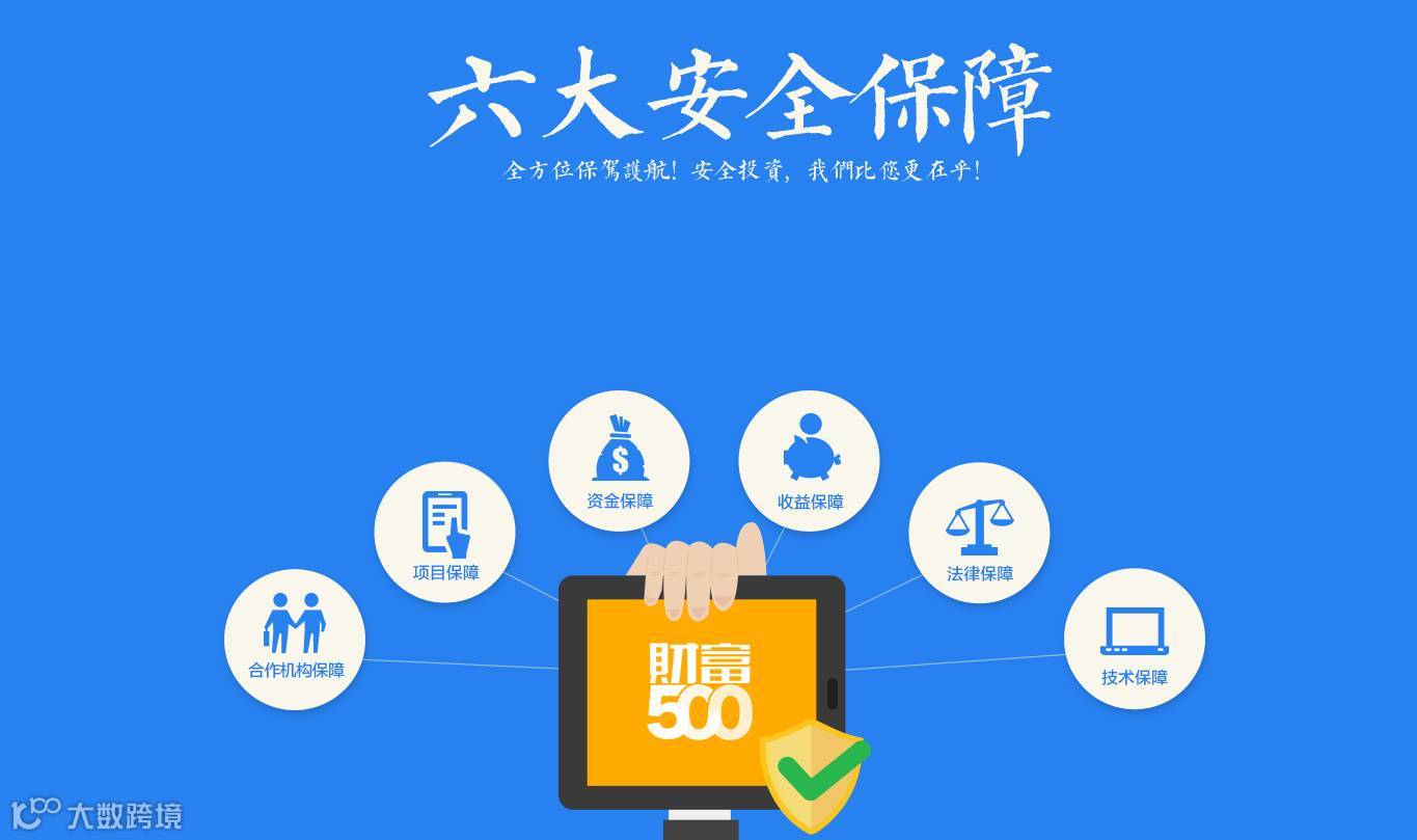 在给投资用户带来高收益的同时,用户资金的安全性是最不容忽视的。财富500精心构建了银行级准入门槛、行业化资产风控标准、第三方征信大数据反欺诈、顶级安全技术保障隐私、资金第三方支付托管、第三方担保机构本息担保以及法律援助基金七重安全保障体系。帮助用户跨地域、跨行业、跨资产类别、跨流动性进行资产配置,真正实现了高安全性的一站式理财体验。通过监管入驻机构的经营状况并向用户披露,充分保障投资人利益,是行业里最值得信赖的安心安全的理财平台之一。