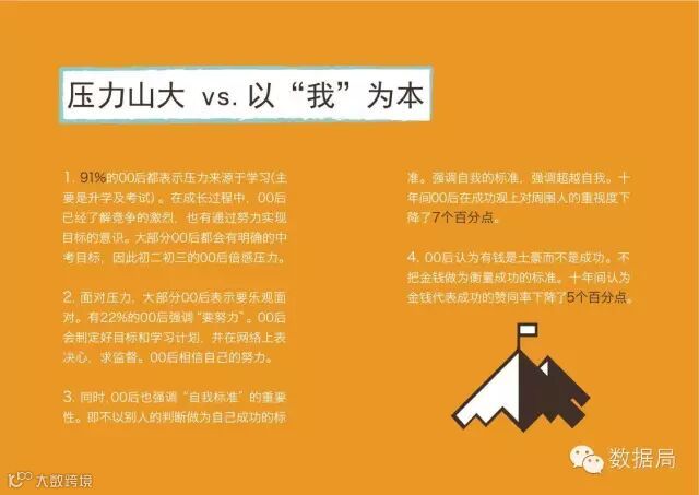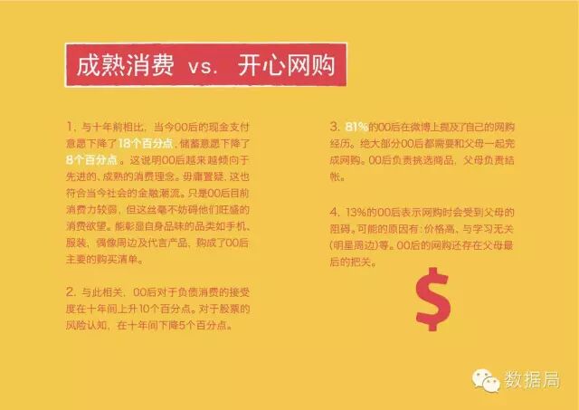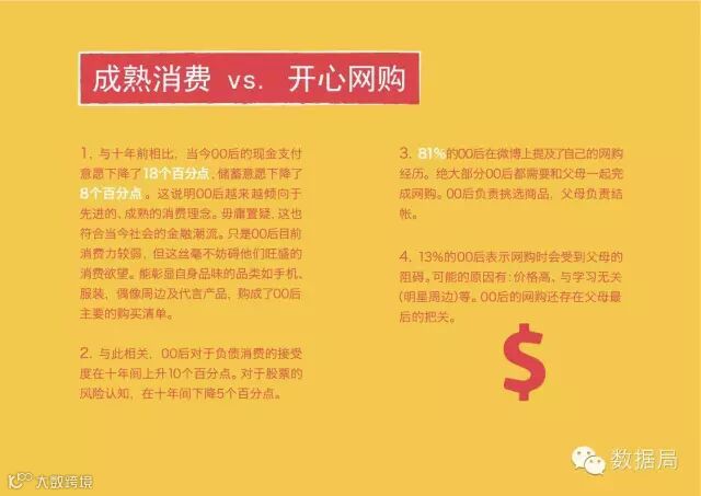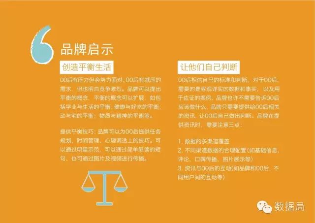 品牌启示:00后有压力但会努力面对。00后有减压的需求,但也明白竞争激烈。品牌可以提出平衡的概念,平衡的概念可以扩展,如包括学业与生活的平衡;健康与好吃的平衡;动与宅的平衡;物质与精神的平衡等。提供平衡技巧:品牌可以为00后提供任务规划、时间管理、心理调适上的技巧。可以通过明星示范、可以通过简单易读的短句、也可通过图片及视频进行传播。